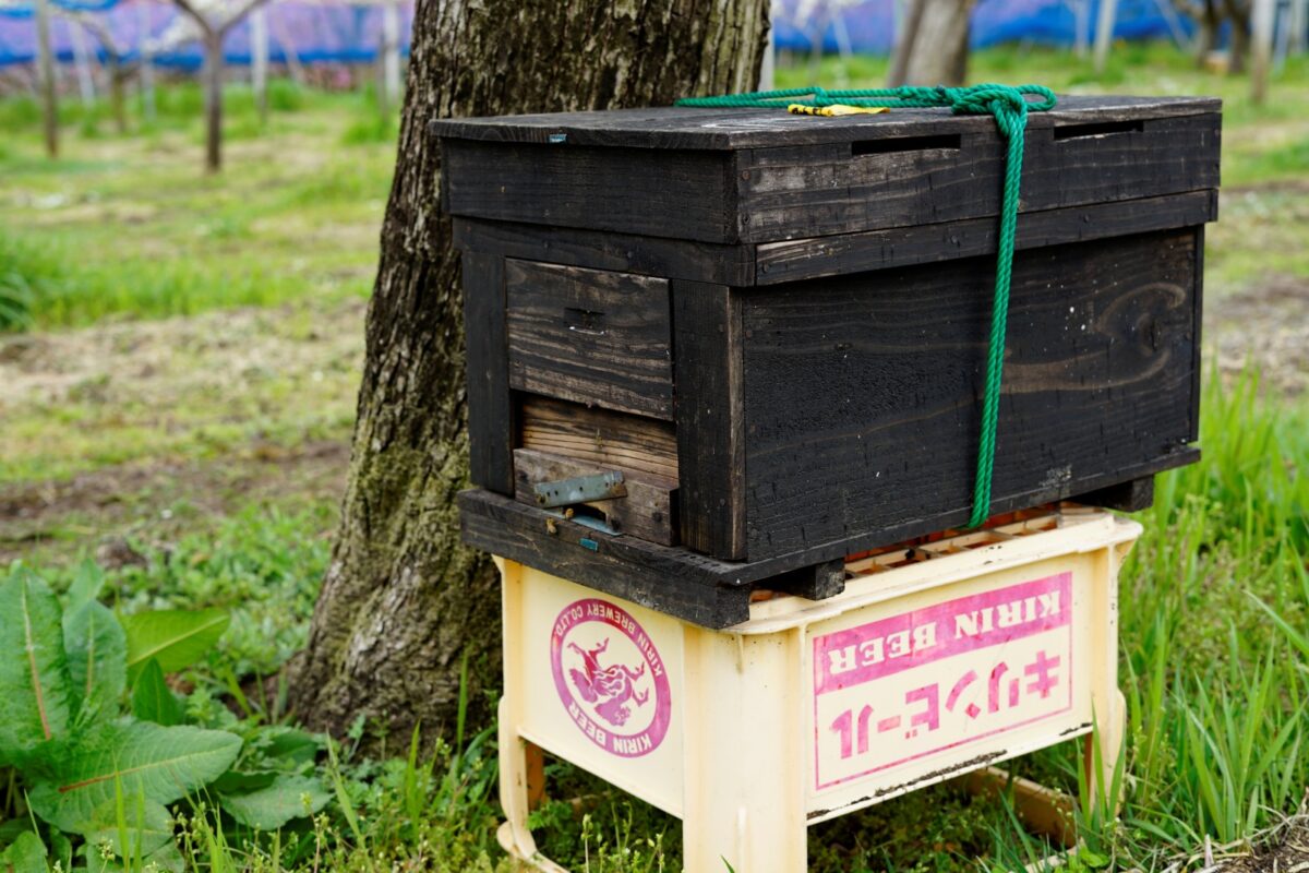 園内には養蜂家から借り受けた巣箱が静かに置かれていました。