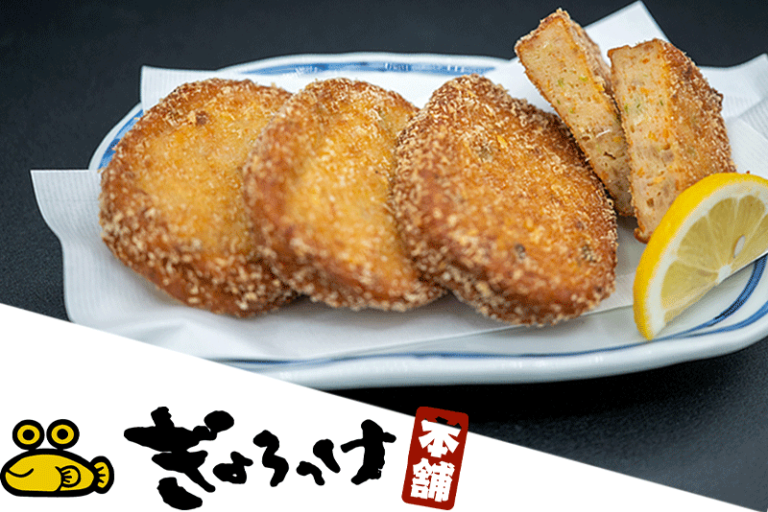 形はコロッケに似ていますが、さつま揚げ風の独特の弾力と食感が特徴です。